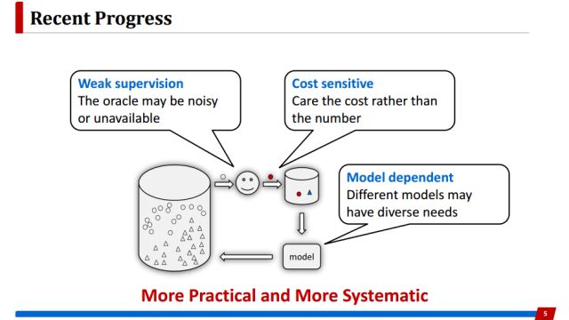 最近还有很多工作依然在关注选择标准的制定上,但是我个人感觉这一年来在主动学习方面的进展,开始倾向于考虑更实际的应用场景,而且更系统的考虑整个学习过程中各个环节。这主要体现在三个方面: