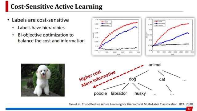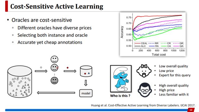 第二方面,考虑代价敏感性的主动学习也有不少工作。首先考虑的是标注者(Oracle)本身是代价敏感的,例如有很多标注者,但是每个标注者要价是不一样的。像有一个成年专家和小孩,一般来说成年专家要价更高一些。但如果考虑标注这样一个图片,如果要看图片里面动画人物是谁,小孩可能标注更准一些。所以在这样场景下可以获得性价比更高的标注,可以用更低的价格获得更准确的标注。这个工作就是在挑选样本的同时去挑选最适合标注该样本的标注者。