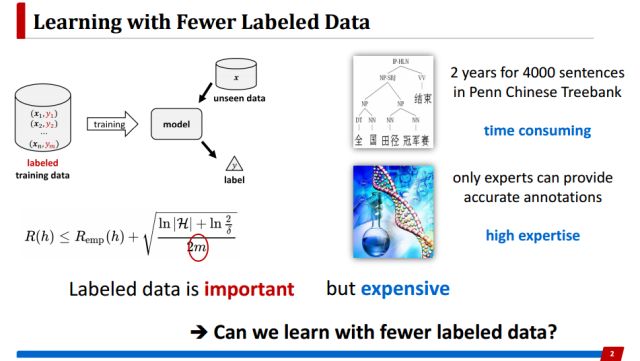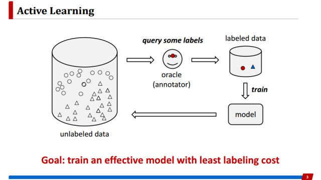 本次报告的题目是《recent progress on active learning 》,我们知道对于监督学习任务,要训练好模型,一般有标记的训练数据越多越好,但很多任务里面有标记的数据非常稀少,而且标注过程往往需要专业的知识,耗时耗力,导致代价昂贵。所以我们希望用更少的标注数据,训练出更好的模型。