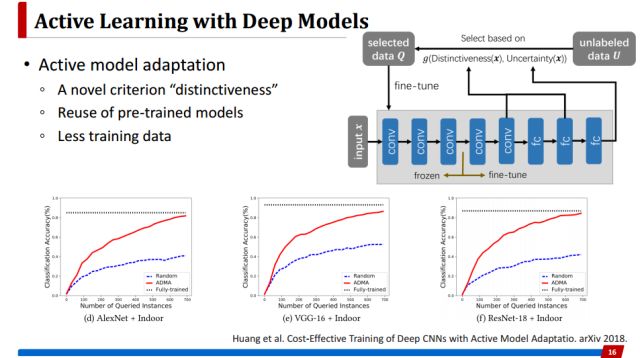 最后一方面,随着学习模型变得越来越复杂,会不会对主动学习提出新的要求?这个工作是我们最近提出来的工作,它所考虑的是,虽然深度神经网络在很多方面都取得了成功,但是当去解决新的任务的时候,需要丰富的经验去设计网络结构,调参数,需要很多的训练数据去训练它。我们希望用一些已经预训练好的模型,在这个模型上用很少的训练数据,把它从预训练的任务上迁移过来,在新的任务上也取得很好的效果。以往的主动学习往往关注的是挑出来的样本是对于提升分类效果最有帮助的,但是深度学习大家都知道它的非常强大能力在于学习出好的特征表示。所以我们定义了一个新的指标distinctiveness,这个指标衡量的是一个样本,在提升深度神经网络特征学习能力方面的作用大小,这是跟以往主动学习所不一样的。从实验结果中可以看到,通过基于distinctiveness的主动选择,在很多模型上用很少数据就可以将预训练好的深度神经网络模型迁移到一个新的任务上并得到很好的效果。