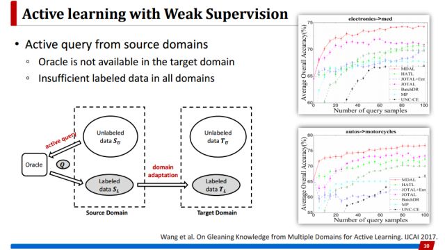 这个工作考虑的是极端情况,某些任务里面连oracle都没有,比如涉及到敏感信息或者安全信息,或者任务要求领域知识非常强,这时候没有Oracle能够提供更多标注。所以我们希望从相关任务里去查询新的样本,把这个样本迁移过来学习,从而帮助目标任务的学习。这个工作的挑战在于,如果把主动学习和迁移学习两个任务独立考虑,有可能挑出来的样本对source domain有帮助,但迁移过来之后对target domain并没有帮助,这就是挑战所在,这工作是基于2016年IJCAI的一个类似工作扩展来的,只是把source domain由一个扩展到多个的情况。