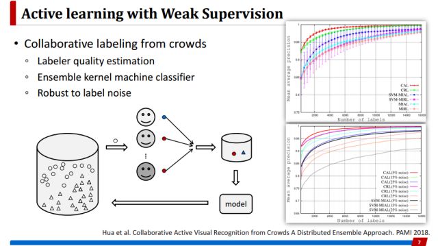 我分别会从三个方面介绍代表性工作。首先是弱监督方面,这是今年的一个工作,作者考虑的不是一个oracle而是一批oracle,但是每个oracle提供的信息可能都是含噪声的。这个方法希望准确评估每个oracle提供的标注质量,并且希望能够得到对噪声鲁棒的分类器。实验证明这个效果还是不错的,对不同程度的噪声都是鲁棒的。
