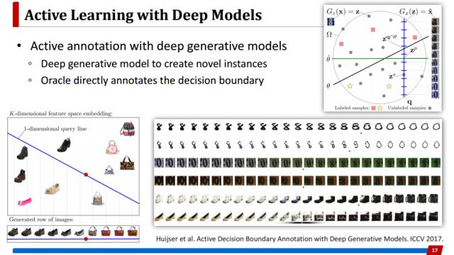 最后一个工作是基于生成模型。原来的主动学习方法都是从未标记数据中挑出来部分样本去标注,这里不再是从一堆数据里去挑选,而是生成一批这样的样本。首先,在decision boundary上面产生很多等分点,每个点对应一个样本,这就是生成的一系列样本。然后让oracle去标注的不是每个样本属于哪个类别,而是这些样本里面,例如,这是鞋子这是包,oracle会标注这些样本里区分这两个类别的临界点在哪里。所以这种方法跟以往所有的主动学习方法思路完全不一样,他让oracle标注的是直接提供一个分类器应该所处的位置,所以具有更强的信息,因此也取得不错的效果。