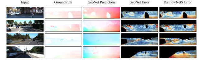 图2:直接光流学习方法DirFlowNetS和本文的方法GeoNet结果的比较。如图中所示:GeoNet在遮挡、纹理模糊、甚至阴影区域都显示出明显的优势。