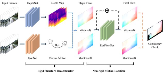 图1:GeoNet概览。它由用于估计静态场景深度的刚性结构重构器和检测动态物体的运动物体定位器组成。在任何一对双向流预测中都采用一致性检查来处理遮挡和非朗伯的表面。