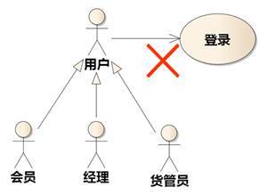 认为第三种更好的另一个理由也和“复用”有关:当几个执行者在使用某些用例时都会有登录的步骤集合,把登录单独分离出来,可以抽象出一个用户执行者,指向登录,如图6-8。