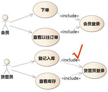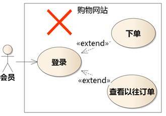 会员登录以后可以下单,也可以查看以往订单,还可以退货……所以图6-5把下单、查看以往订单画成登录的扩展。这是错的。并不是先做A然后可能做B或C,B和C就成了A的扩展。例如,张三先吃饭,然后可能看电视,也可能上厕所,也可能散步。如果把看电视、上厕所、散步画成吃饭的扩展,意思就成了“张三可能会以上厕所的方式吃饭”或 “上厕所是张三达到吃饭目标的一条路径”。