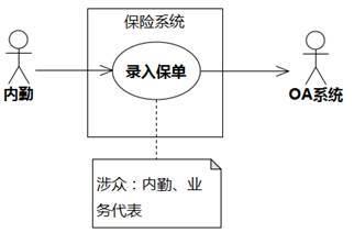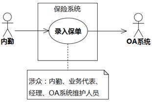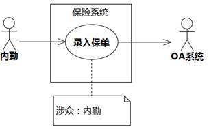 用例的执行者如果是人类,当然是用例的涉众。执行者如果不是人类,就不是涉众,因为它没有利益主张。针对图6-11中保险系统的“内勤→录入保单”用例,内勤是人类,是涉众,而OA系统不是人类,不是涉众。