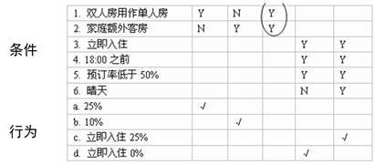 如果用文字说明业务规则比较困难,可以使用一些辅助的手段,例如决策表、决策树。图6-23就是一张决策表,描述了宾馆打折的规则。
