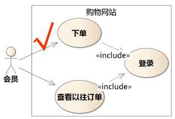 按照图6-6的做法,下单用例规约的步骤里,应该有表示包含登录用例的步骤集合:会员【登录】。“登录”二字加了粗括号表示这是一个被包含用例,它的步骤和约束在另外的地方描述。不喜欢粗括号可以用加下划线等其他方法以示区分。