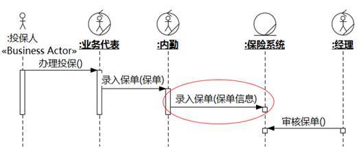 说到这里,也许您已经看出来,业务建模对于识别涉众非常有帮助。如果我们在需求之前做了业务建模,会更了解一件事情的前因后果,大多数涉众都能够从业务序列图中看出来。例如,从图6-15的业务序列图中,业务对象内勤、业务代表、经理和投保人很容易看出来。另外,消息参数“保单信息”提醒建模人员还会涉及被保人和受益人。这样,图6-14中所列举的“内勤→录入保单”的涉众就找齐了。