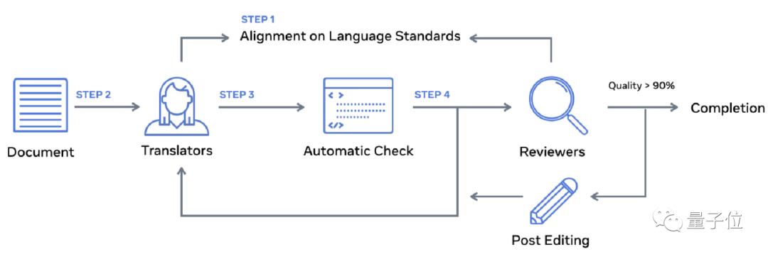 首先,译员们翻译Flores-200的全部句子,并检查;然后,独立审查员小组开始审查翻译质量,根据他们的评估将一些译文送去进行后期编辑。