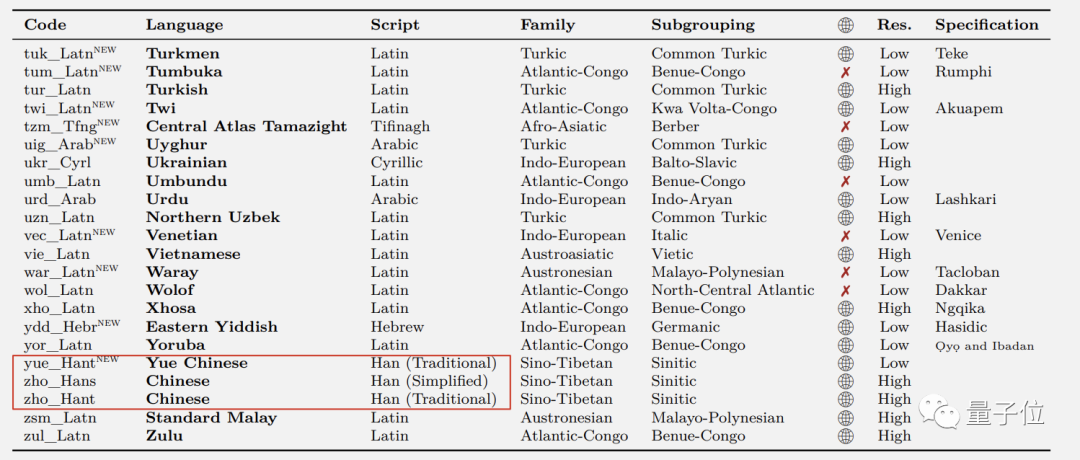其二,是对200种语言建模:研究者开发了一个语言识别系统LID(language identification systems),标记出某段文字是用哪种语言写的。
