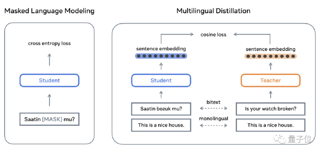 为了对小众语言进行较好的建模,研究者开发了一种“学生-教师挖掘法” (Student-Teacher Mining)该方法的内容是:让一个大规模的多语言句子编码器的教师模型,与几个语料少的学生模型相互学习整合。