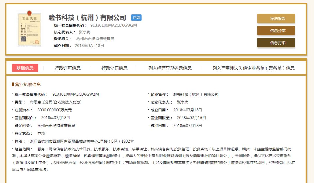 公开资料显示,这家独资子公司名为“脸书科技 (杭州) 有限公司”,位于浙江杭州,其唯一股东是 Facebook 香港有限公司,注册资本为 3000 万美元,法定人代表为张京梅。开展的业务将包括网络信息技术开发和相关服务、投资咨询和营销策划,不过并没有详细说明具体的服务。