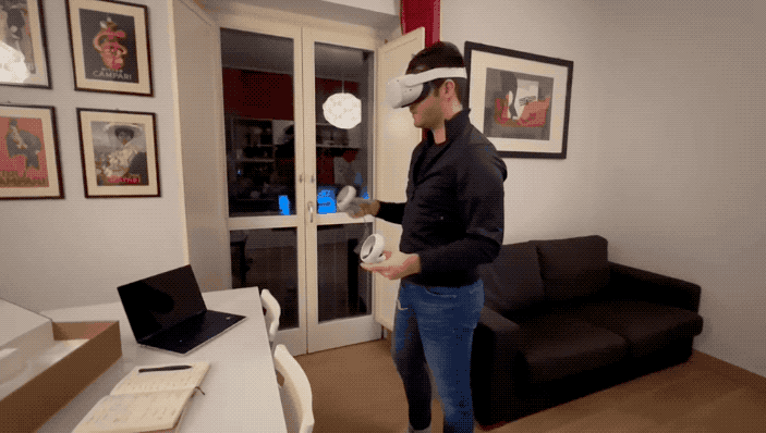 瞧,一位外国小哥头戴VR,手持设备,就开始了一通“谜之操作”: