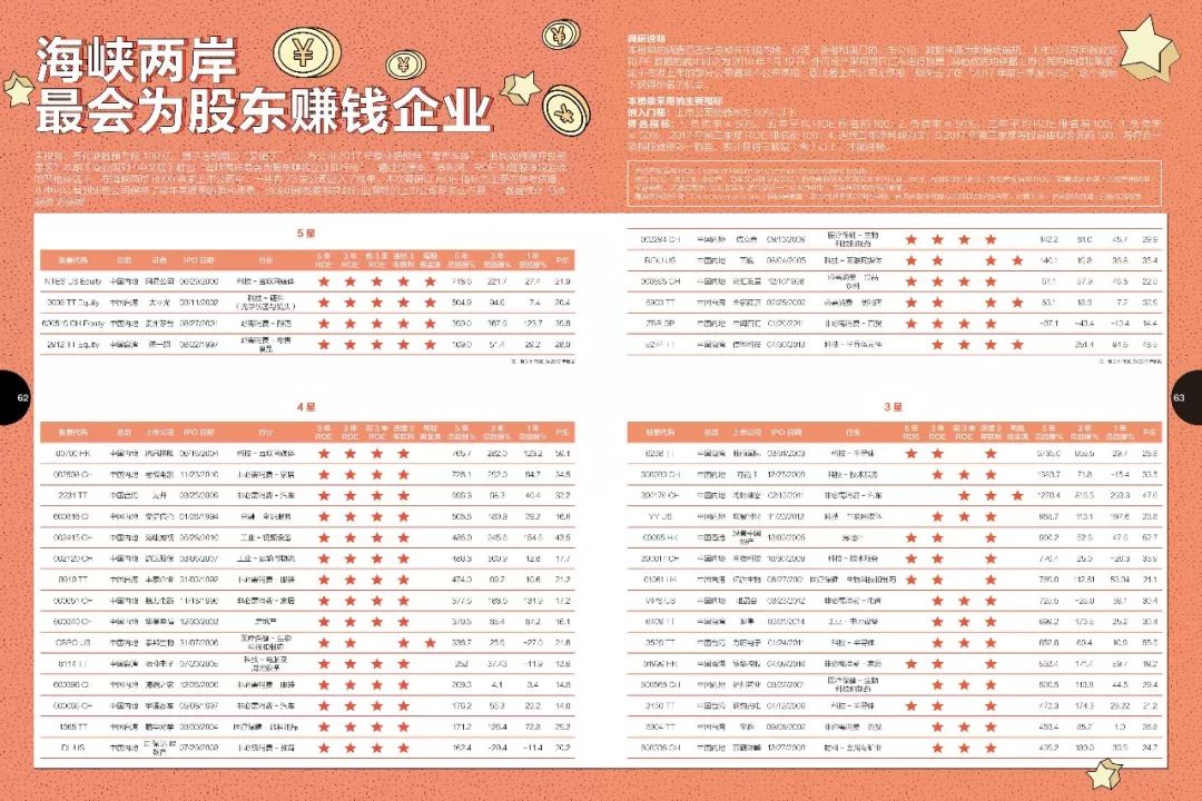《商业周刊/中文版》首次推出“海峡两岸最会为股东赚钱的企业排行榜”。检视总部设在中国内地、中国香港、中国澳门、中国台湾等地,在全球上巿一共8000多家企业之中,哪些公司最会为股东赚钱?最基本的筛选门槛是负债比,必须≤50%。然后,再从符合资格的企业中,依据5年、3年、与2017年前三季的平均ROE,排出前100大的名单,每通过一项检验就给一颗星。另外两项指标则是,企业必须连续3年获利、以及每股现金流排名前100名。经交叉比对后,必须获得三颗星(含)以上的公司才能入榜,共有73家,进榜率不到1%。