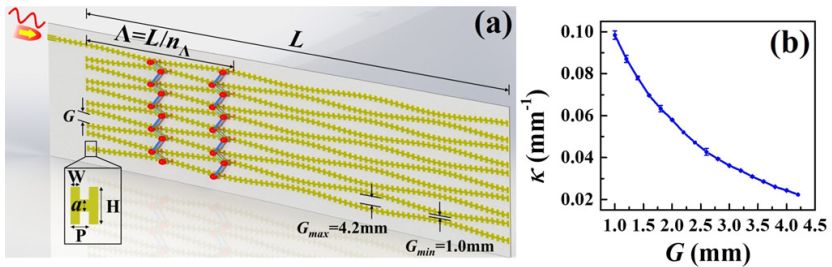 图二:(a)微波共面波导阵列结构;(b)耦合系数随波导间距的关系