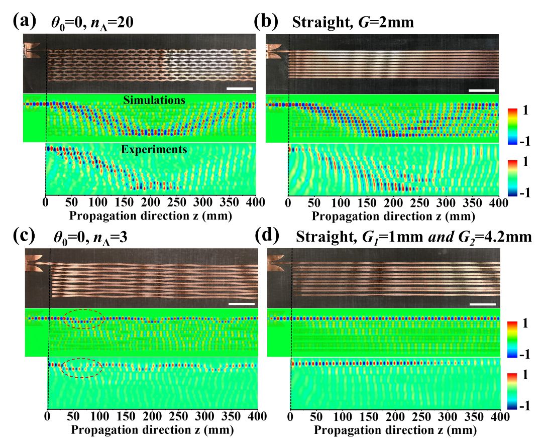 图一:(a)高频驱动的周期性弯曲波导阵列与光场演化;(b)均匀静态的波导阵列与光场演化;(c)Floquet波导阵列与光场演化;(d)静态拓扑波导阵列与光场演化。