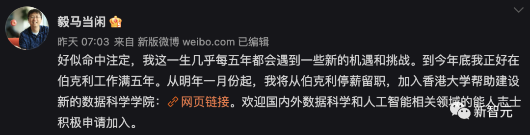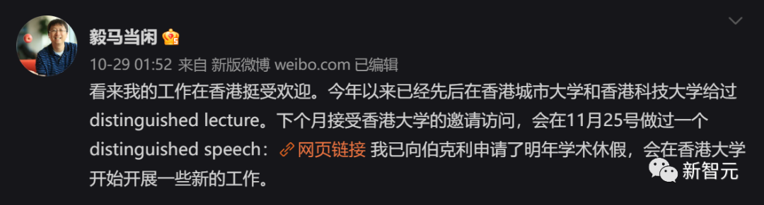 其实,就在颜宁宣布回国的前几天,马毅已经在微博上透露了自己接下来的动向:「已向伯克利申请明年学术休假,将在香港大学开展新工作」。