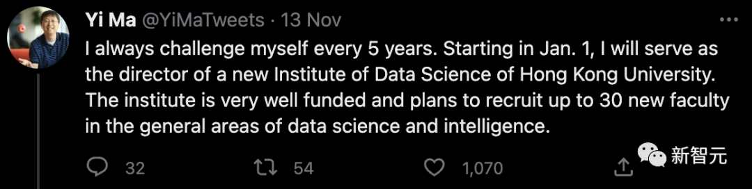 【新智元导读】50岁生日当天,马毅教授在社交媒体上宣布,自己明年起将从伯克利停薪留职,加盟香港大学数据科学学院,并出任院长一职。