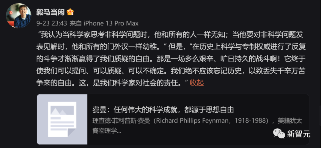在9月23日,马毅教授曾转发一篇物理学家费曼的故事,并摘录了费曼的这句话:「我们绝不应该忘记历史,以致丢失千辛万苦争来的自由。这,是我们科学家对社会的责任。」