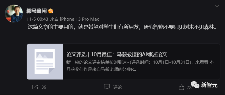 就在10月,马毅教授的AI综述论文还被ReadPaper评选为10月最佳论文。