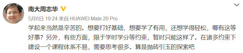 此外,周志华院长还表示学起来当然是辛苦的。想要打好基础,想要学了有用,还想学得轻松,哪有这等好事?另外,有些方面,限于学时学分等约束,暂时只能这样了。在诸多约束下建设一个课程体系不易,需要思考很多。算是抛砖引玉的探索吧