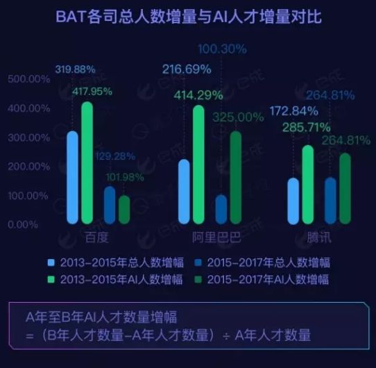 最近,笔者在网上发现了一个报告,报告名字:《BAT人工智能领域人才发展报告》,发现BT招聘AI的速度提升了近400%,其中将百度增量417夺得TOP1,阿里414%的招聘需求度位列TOP 2。
