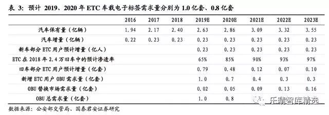 因此,预计2019-2020年车载电子标签市场空间分别为87.3亿元、59.1亿元。ETC抢装期过后,车载电子标签预计每年仍有20余亿元市场空间。