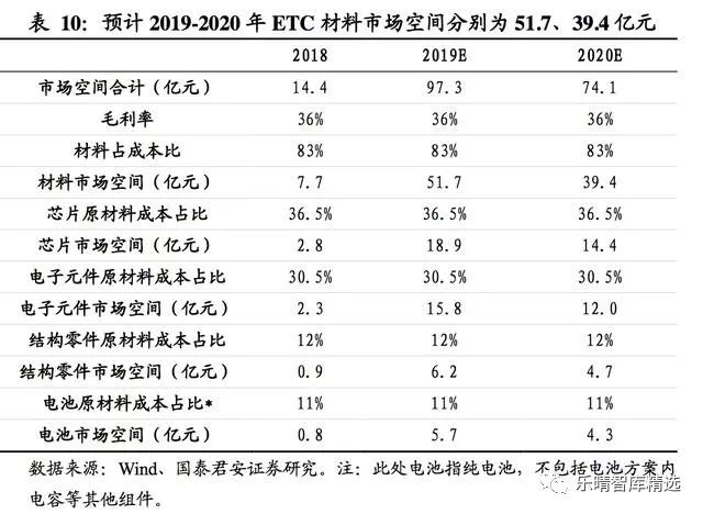根据聚利科技2018年车载电子标签原材料占比成本比例为83.2%,我们取原材料占成本比为83%,得到2018-2020年ETC材料市场空间分别为7.7亿元、51.7亿元、39.4亿元。