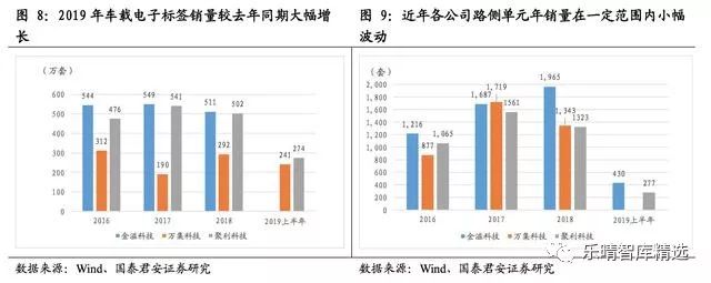 由于抢装,车载电子标签销量于2019上半年大幅增长。2019上半年,万集科技、聚利科技分别售出车载电子标签241、274台,其中万集科技2019上半年销售量达到公司去年全年销售量的83%。