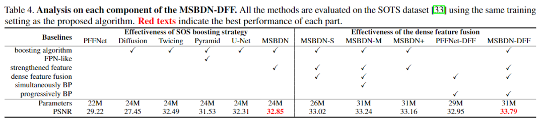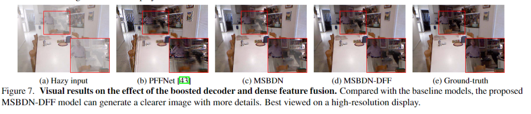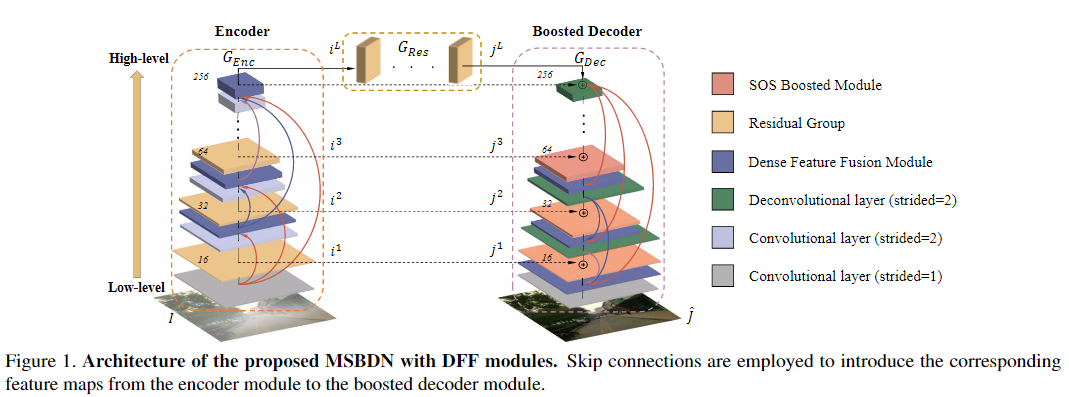 本文首先证明了boosting策略也将促进图像去雾任务。考虑到这两个原理,本文提出了一种基于U-Net架构的具有密集特征融合(DFF)的多尺度增强去雾网络(MS-BDN)。将网络的解码器中引入图像恢复模块,具体的,在解码器中并入了“Strengthen-Operate-Subtract”(SOS)增强策略,以逐步恢复无雾图像。由于U-Net的编码器中存在下采样操作,可能无法从U-Net的解码器有效地检索空间信息。为了解决这个问题,本文还提出了一种基于反投影技术的DFF模块,以有效融合不同层次的特征,并证明了该模块可以同时保留高分辨率特征的空间信息,并利用非相邻特征进行图像去雾。大量实验评估表明,所提出的算法与最新的除雾方法相比具有出色的性能。