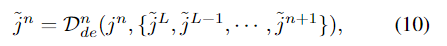 基于式(9)中的反投影算法,本文提出了一种DFF(Dense Feature Fusion Module)模块,用于有效地纠正丢失的信息并利用非相邻级别的特征。提出的DFF旨在通过错误反馈机制进一步增强当前层级的特征,并在编码器和解码器中使用。如图1所示,在每个层级引入了两个DFF模块,一个在编码器中的残差组之前,另一个在解码器中的SOS增强模块之后。编码器/解码器中增强的DFF输出直接连接到编码器/解码器中的所有剩下的DFF模块,以进行特征融合。