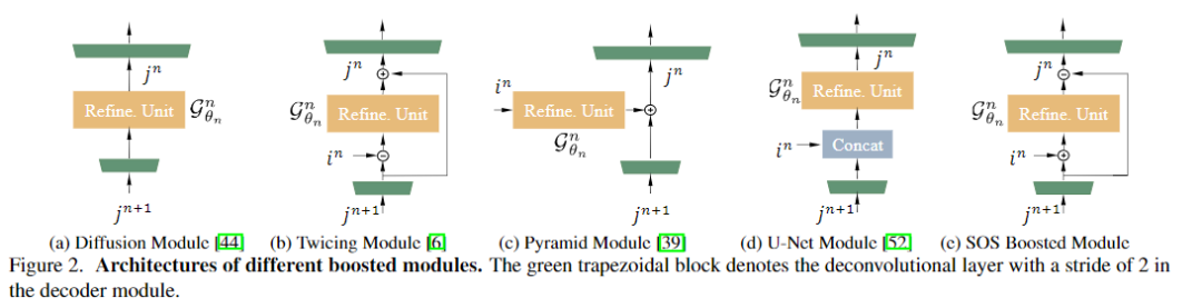 列出了用于除雾的SOS增强模块的四个替代方案。diffusion 和 twicing方法可用于设计boosting模块,如图2(a)和图2(b)所示。它们可以分别表示为