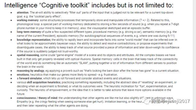 使得一个软件系统能够被称为认知架构的标准也鲜被强调。大多数综述宽泛地定义认知架构为智能的一个蓝图,更具体地,是一个关于心智表征以及运行在这些表征之上的计算过程的设想,它们使得一定范围内的智能行为成为可能([21], [22], [23], [24], [25])。总的来说,新的认知架构不需要包括已有的认知架构,例如 Soar,ACT-R,EPIC,LIDA,ICARUS 等。然而,当它并不是那么常见或是一个全新的项目时,我们并不知道考虑现有的这些认知架构是否必要。举个例子,AKIRA 是一个明显的不能自我统一地认为其是一个认知架构 [26],但是它的特性仍然被很多综述提及 [27]。类似的,知识库 Cyc [28] 从未对任何通用智能有所声称,却仍然在一篇论文中被总结为一个 AGI 架构 [29]。