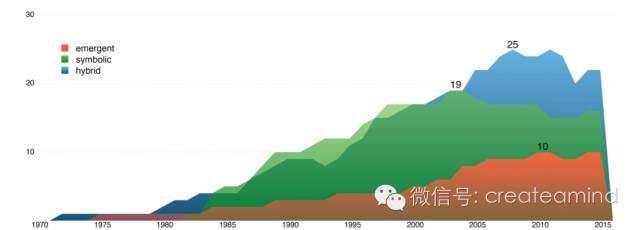 图 3 1973 至 2016 年间,活跃的符号式(symbolic)、层创式(emergent)和混合式(hybrid)架构的可视化。在图上显示了同时活跃的项目的最大数量。