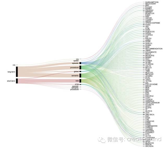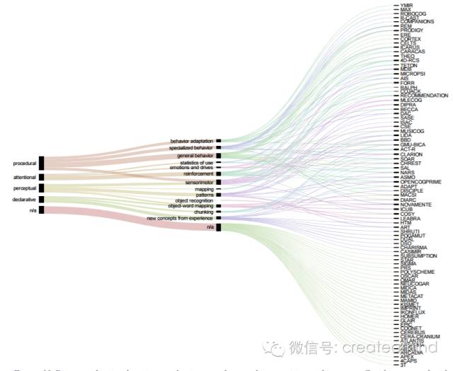 正如我们早些时候提到的,给已经实现的认知架构创建一个广泛的和有组织的编目的第一步是 [1]。这个概述包含了 26 个项目的扩展描述,其中包含的信息有:简要概述、主要元素的原理图、共同组分和特征(记忆类型、注意、意识等)、学习和认知发展、认知建模和应用、扩展性和局限性。这一类的调查将一些不相交的社区的研究者聚集到了一起,并帮助建立了这些不同方法和他们所使用的术语之间的映射。但是,这种描述性的和表格式的格式让我们无法对这些架构轻松地进行比较。因为我们的架构样本很大,所以我们实验了可做替代的可视化策略,例如冲积图(alluvial diagram)和圆图(circular diagram),它们常常被用于组织复杂的表格数据。这些图的交互式版本让我们可以探索这些数据和查看相关索引。