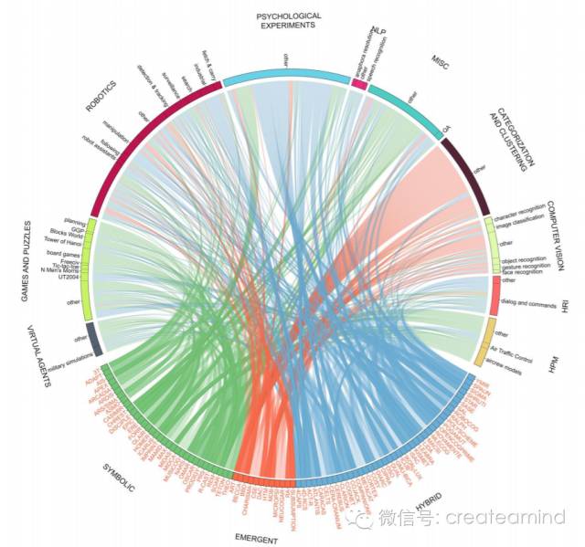 一些应用可能会被划分到多个组。例如,装上一只机器手臂的 Soar 一直被用来玩棋盘游戏,这就同时关涉到机器人、游戏和拼图以及心理学实验。为了避免让这张图过于复杂,在这些案例中我们只将 project 放在了主要的组中考虑,在 Soar 的例子被划为游戏,因为它在机器人上的应用并不是很大,而且心理学实验组主要是使用 ACT-R 的 fMRI 实验。