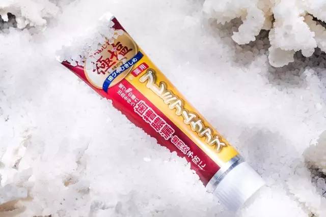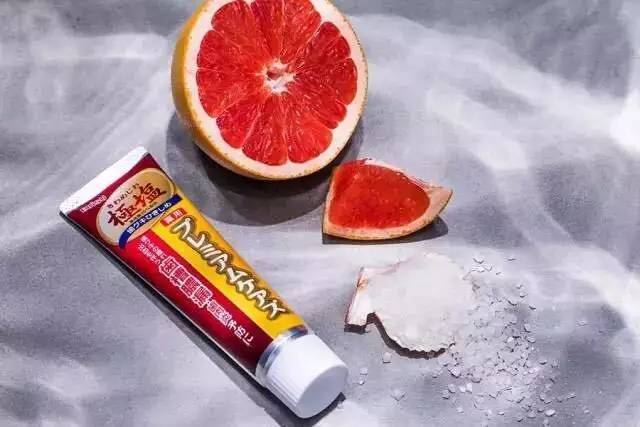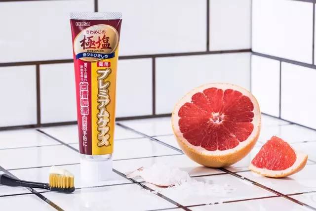 这是一款添加了药用盐颗粒和柚子精华做成的药用牙膏,叫极盐牙膏。