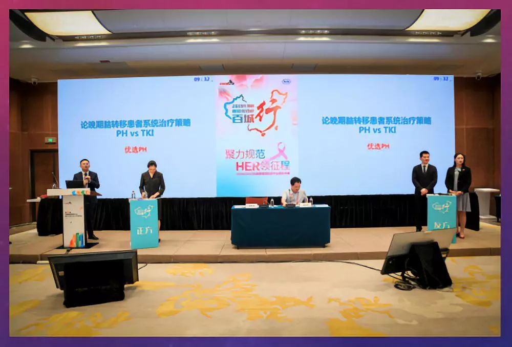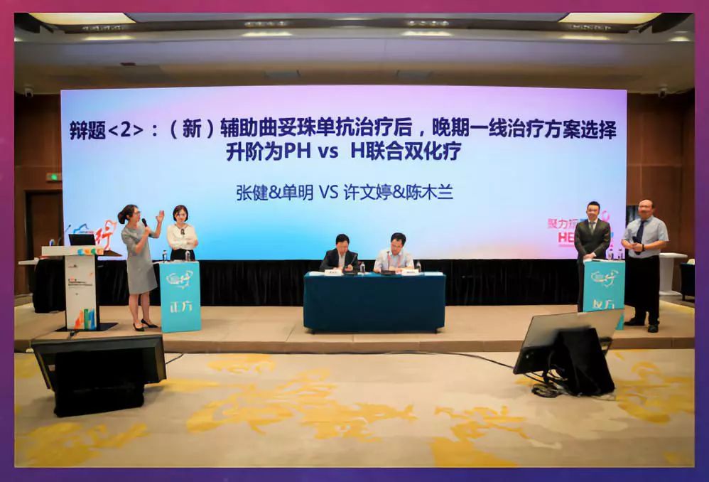 最后的重磅环节是乳腺癌规范化诊疗热点辩论,由徐兵河教授和潘跃银教授担任主持。辩论赛主要包括立论、自由攻辩和总结陈词三大部分,正反双方各由2位选手抽签组队,相互协作。