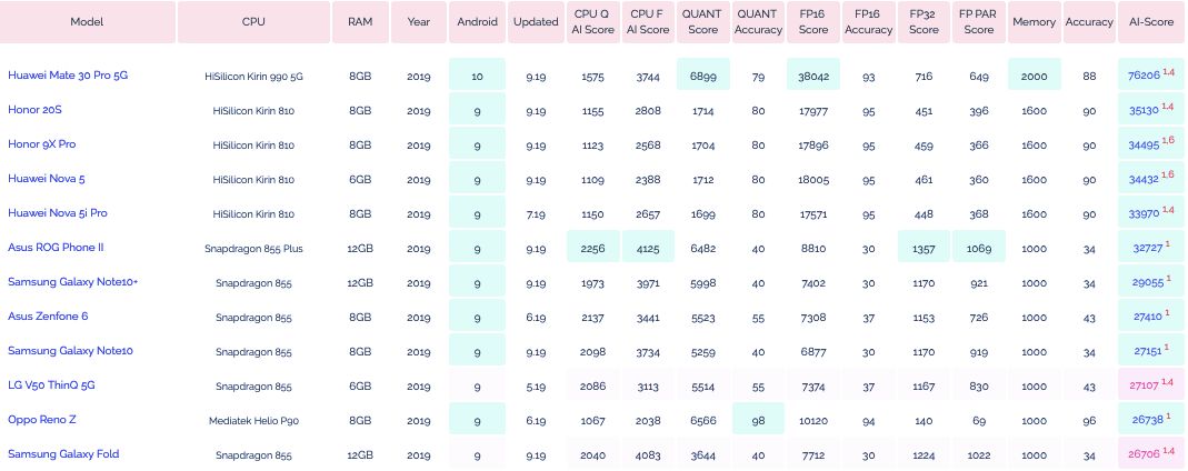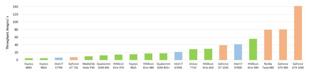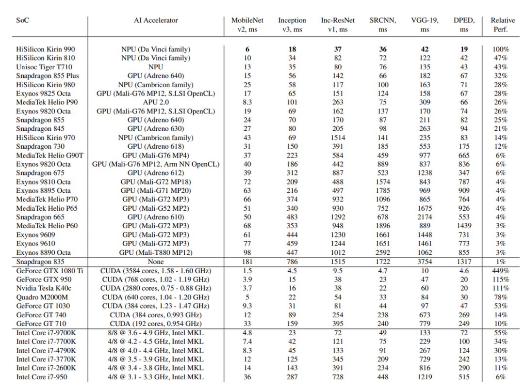 为了测试移动设备芯片的深度学习性能,瑞士苏黎世联邦理工学院去年开发了一款名为 「AI Benchmark」的应用,对多款搭载深度学习加速芯片的移动设备进行基准测试。最近,AI Benchmark 已经更新到了 3.0,研究者也发布了最新的测试结果。报告显示,麒麟 990(5G 版)的 AI 性能远超高通骁龙 855+,性能甚至接近常见云服务 GPU 英伟达 Tesla K80 的四分之三。