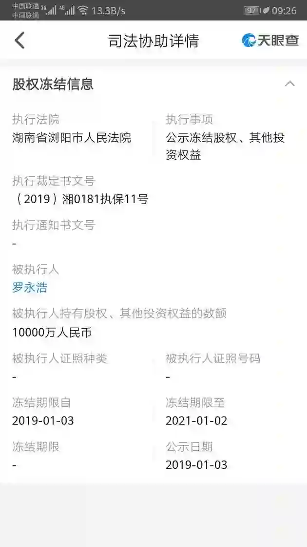 36氪讯,天眼查显示,成都锤子科技集团有限公司新增一则司法协助信息。湖南省浏阳市人民法院近日冻结了罗永浩在成都锤子科技集团的股权,涉及金额1亿元,冻结日期自2019年1月3日至2021年1月2日。去年12月,该法院就冻结了罗永浩所持锤子科技(北京)股份有限公司股份,冻结期限自2018年12月17日至2020年12月16日,具体数额未公布。