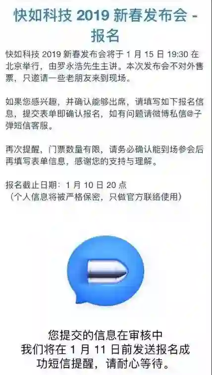 快如科技将于1月15日晚上7:30在北京举行新春发布会。公告显示,本次发布会由锤子科技CEO罗永浩主讲。快如科技在公告中称,本次发布会不会对外售票,只邀请一些老朋友到现场。(IT之家)