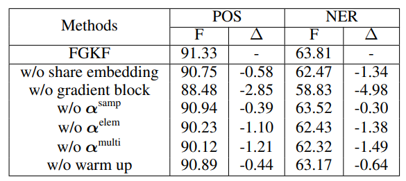 我们在Twitter数据集上进行了消融实验(见表6),发现在训练目标域模型时固定源域模型的参数是十分重要的,同时共享embedding层,预训练也对结果产生了一定影响。