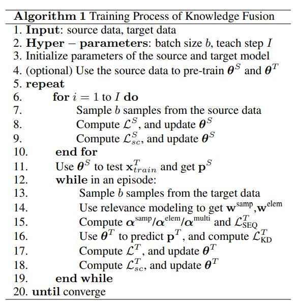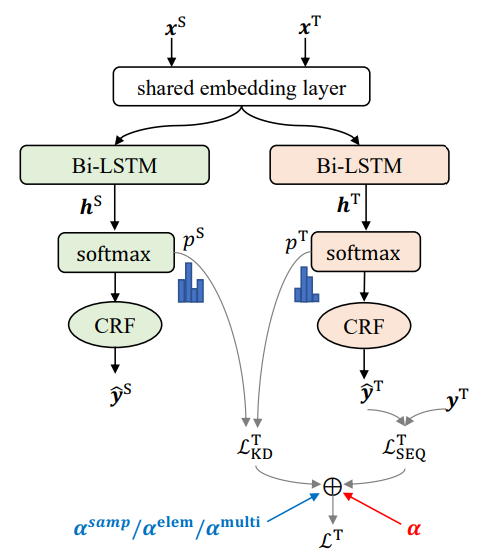 知识蒸馏(knowledge distillation)为学生模型(student model)的每个样本和元素提供了从老师模型(teacher model)学习的目标,在这里我们将源域模型作为老师模型,目标域模型作为学生模型。目标域模型的损失函数由两部分组成:序列标注损失和知识蒸馏损失,其中序列标注损失可以看作从目标域数据学习的知识,知识蒸馏损失可以看作从源域模型学习到的知识,超参alpha用来平衡二者。