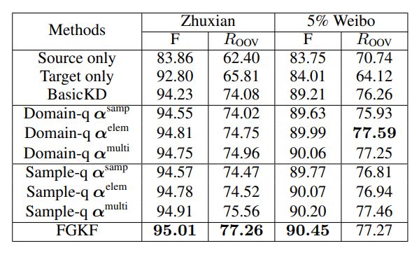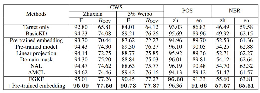 我们使用F1-score和OOV recall来评价在中文分词领域适应上的表现,我们比较了不同的领域表示方案和不同层次的知识融合方案,结果见表3。可以发现在领域表示的层面上,样本级别的领域表示(Sample-q)好于领域级别的领域表示(Domain-q),在知识融合的层面上,多层级的方式好于元素层面的融合,也好于样本层面的融合。我们最终的方案为基于样本级别领域表示的多层次知识融合方法(FGKF)。