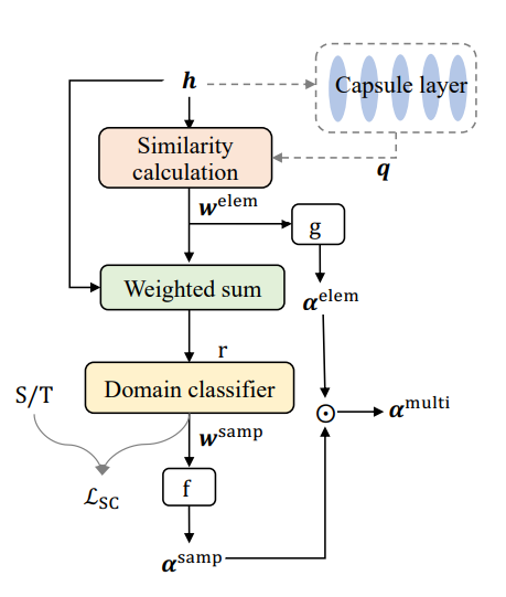 (a)domain-q:q是可训练的领域向量,领域内所有的元素共享q;(b)sample-q:q是从每个样本抽出的领域相关的特征,每个样本内部的元素共享q,这里我们使用胶囊网络(capsule network)来抽取这个特征。通过计算隐层与领域表示的相似性得到元素级的领域相关性。