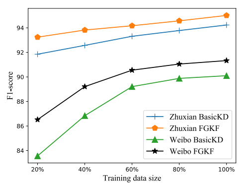 我们也研究了不同的目标域数据规模对领域适应结果的影响(见图5),当目标域数据较少时(20%),BasicKD与FGKF有较大的差距,说明此时领域相关性是十分重要的,随着目标域数据规模的增加,BasicKD与FGKF仍然存在的一定的差距。
