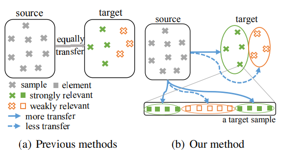 在本文中,我们提出了一个细粒度的知识融合方案来控制学习源领域和保持目标领域之间的平衡,通过建模样本层面和元素层面的领域相关性,以及将其引入到领域适应过程中,有效的减少了负迁移(negative transfer),同时增强了领域适应的效果。